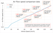 As a result of the test,(Figure 1) it was confirmed that the HKS engine cover allows more fresh air to pass between the head and the tail of the hood than the stock engine cover at the same speed.