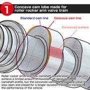 3. With a conventional direct-acting valve train, the maximum lift is usually determined by the size/diameter of the valve lifter. Selecting a high-lift camshaft without taking this into consideration often results in the camshaft lobes travelling beyond the surface of the valve lifter. This causes the lobe to make contact with the edge of the lifter, damaging both components over time. Therefore, the ideal performance orientated high-lift camshaft needs to have a profile that maximizes lobe travel on the lifter without exceeding the outer edge. VALC profile camshafts have achieved this ideal by deliberately reducing the maximum cam velocity to limit lobe travel on the lifter surface. (Maximum cam velocity = lobe travel distance on lifter). Compared to standard profile camshafts of the same lift, VALC profile camshafts are able to then then off-set the difference for even greater lift/performance gains