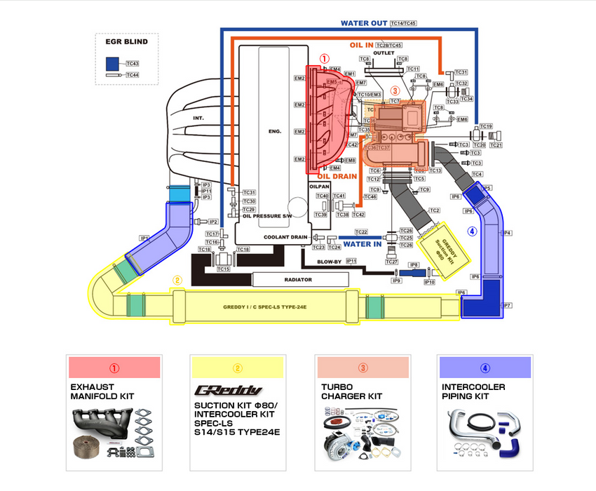 This product is designed to be used in conjunction with the TOMEI KA24DE TURBO KIT, GREDDY SUCTION KIT (80 diameter) and GREDDY INTERCOOLER KIT (Spec-LS S14/S15 TYPE24E). Alternative products from other manufacturers can also be used instead